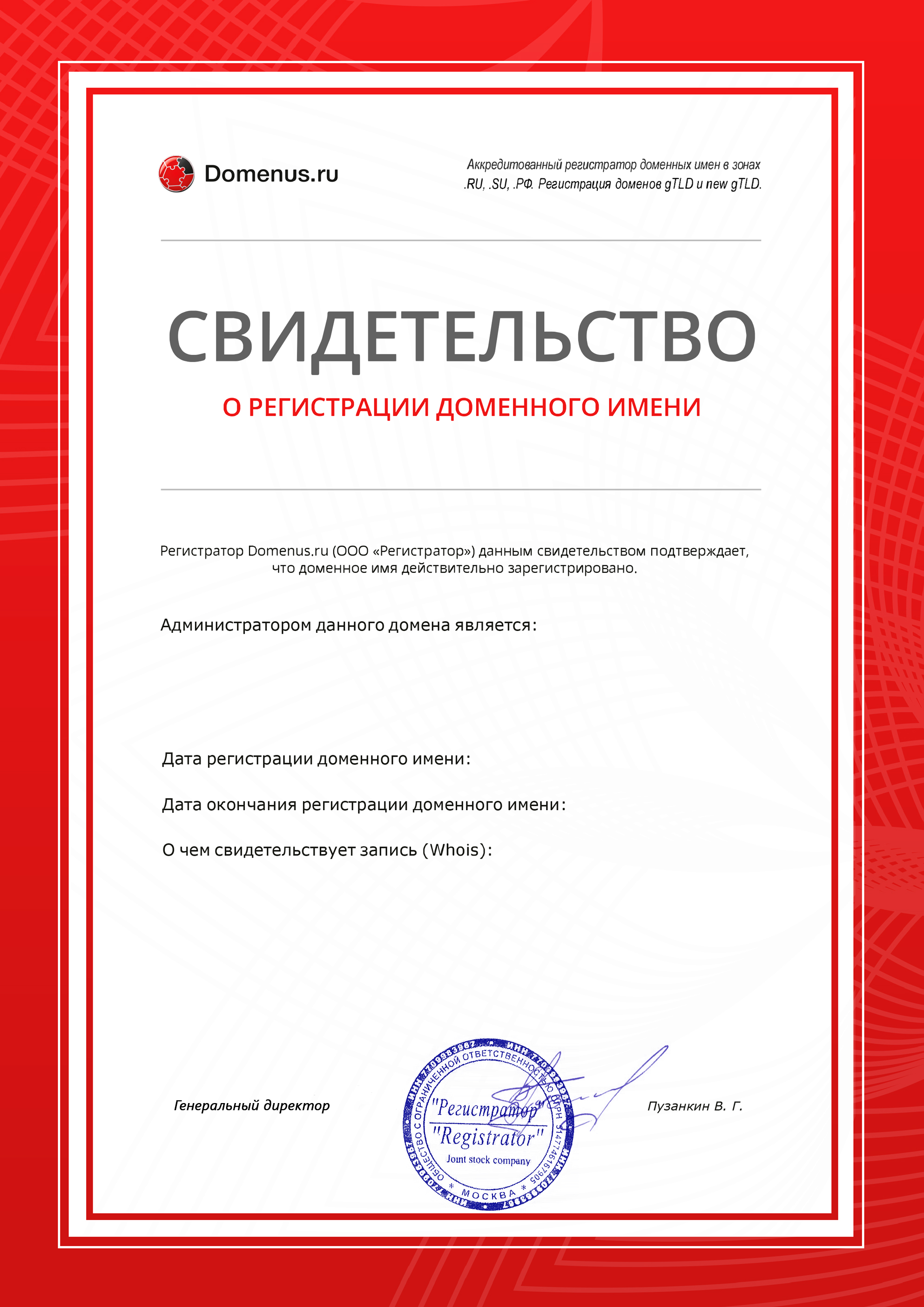 Свидетельство о регистрации доменного имени